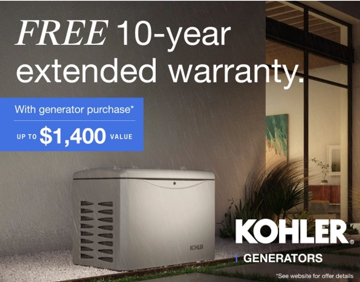 To qualify for this offer, a Kohler certified partner must submit the required online submission form and valid proof of order (consumer quote or invoice) by May 31, 2025. The generator must be installed and registered no later than October 31, 2025, by a Kohler certified partner. Offer not available at eCommerce or retail businesses. Kohler resellers are not eligible for this offer. Offer may not be combined with other offers or promotions. Generators registered by a non-certified Kohler partner or the homeowner are not eligible for extended warranties. Generators used in an off-grid/prime power application are not eligible for extended warranties.